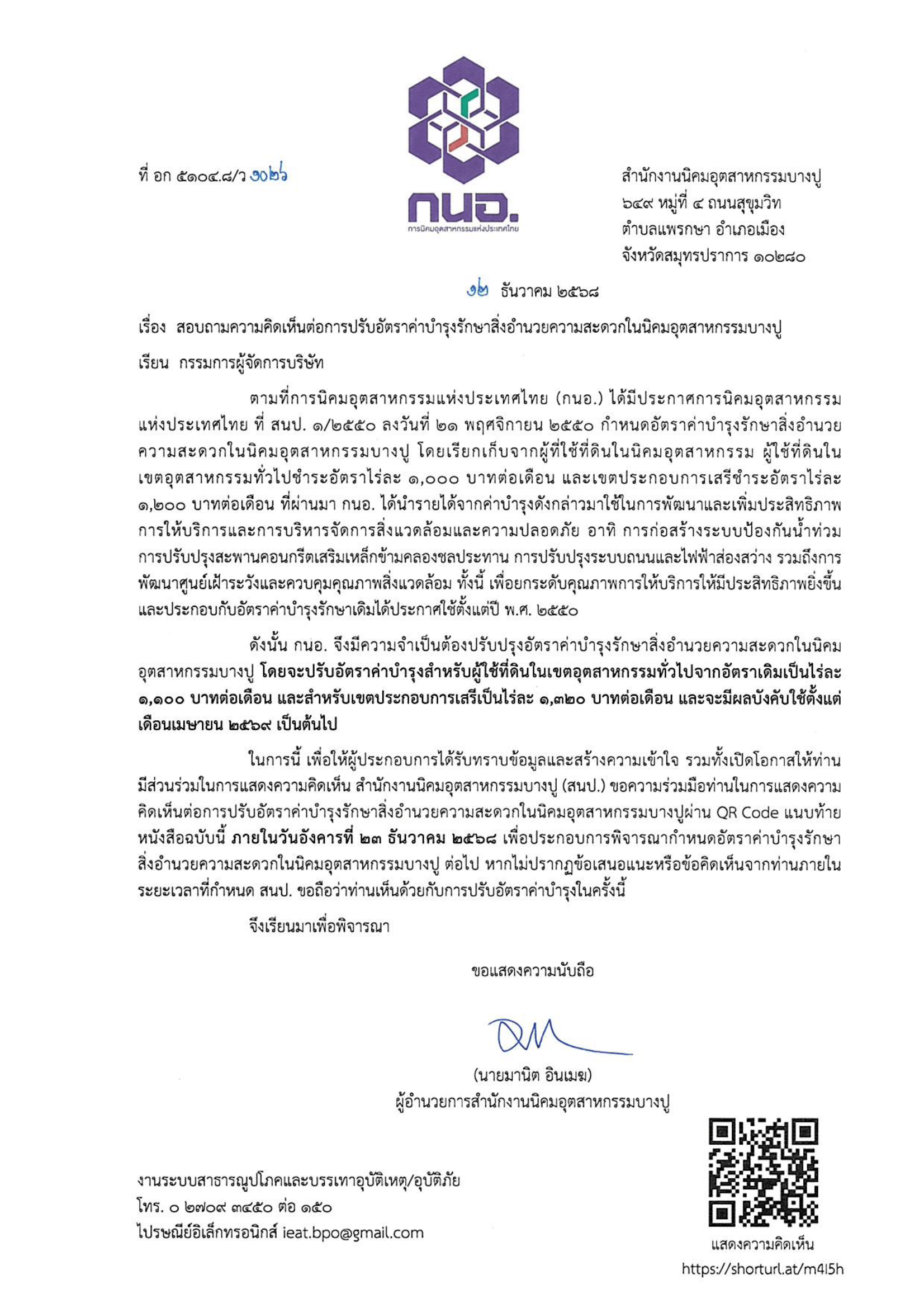 สอบถามความคิดเห็นต่อการปรับอัตราค่าบำรุงรักษาสิ่งอำนวยความสะดวกในนิคมอุตสาหกรรมบางปู 2025-12-19 08:49:00