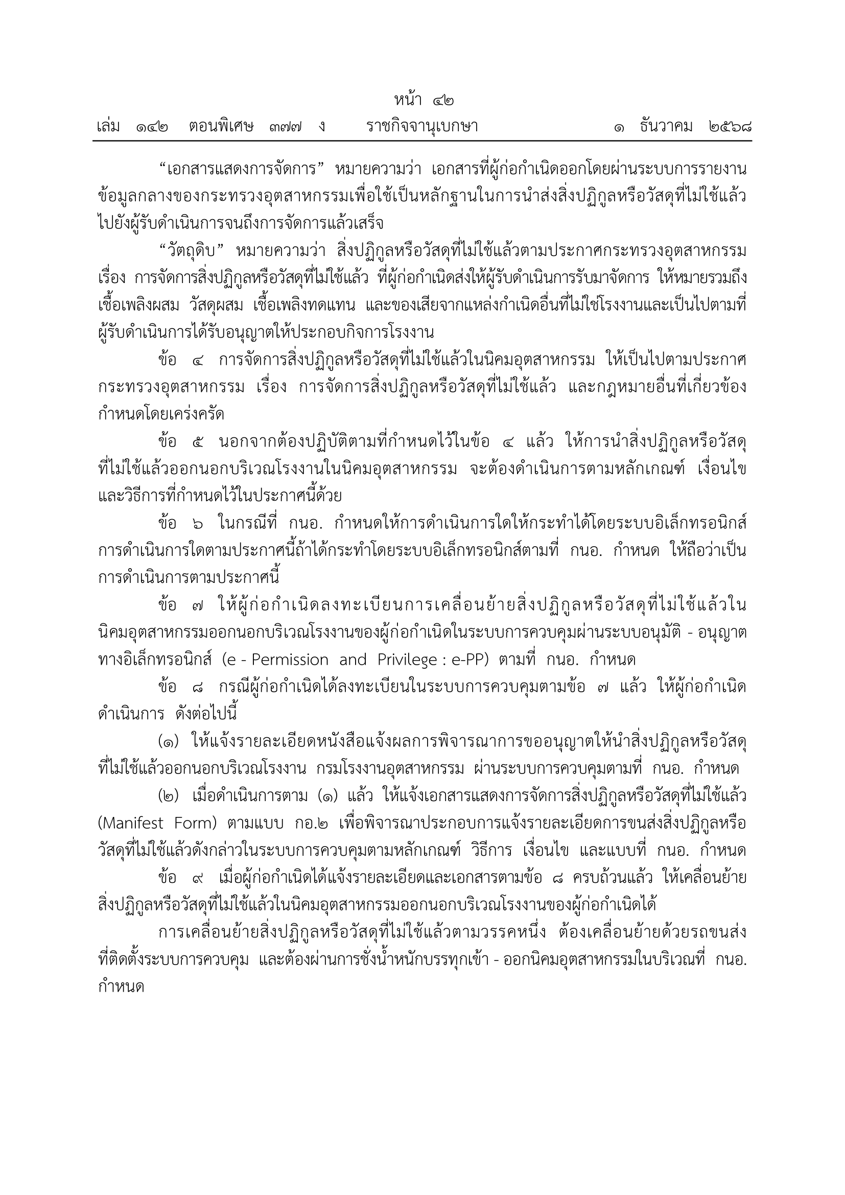 แห่งประเทศไทย ที่ 205/2568 ลงวันที่ 11 พฤศจิกายน 2568 เรื่อง การควบคุม กำกับและติดตามการเคลื่อนย้ายสิ่งปฏิกูลหรือวัสดุที่ไม่ใช้แล้วในนิคมอุตสาหกรรม เพื่อใช้ในการบริหารจัดการสิ่งปฏิกูลหรือวัสดุ