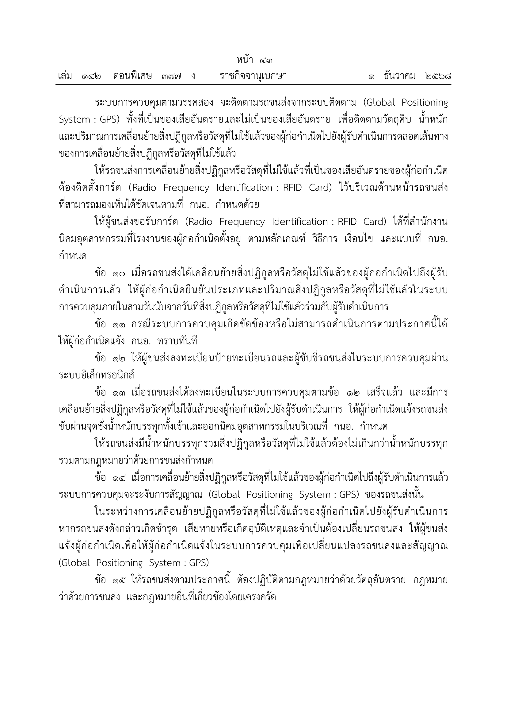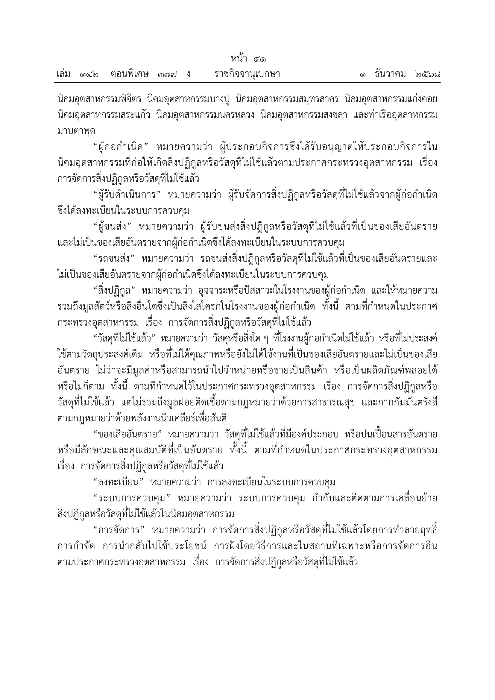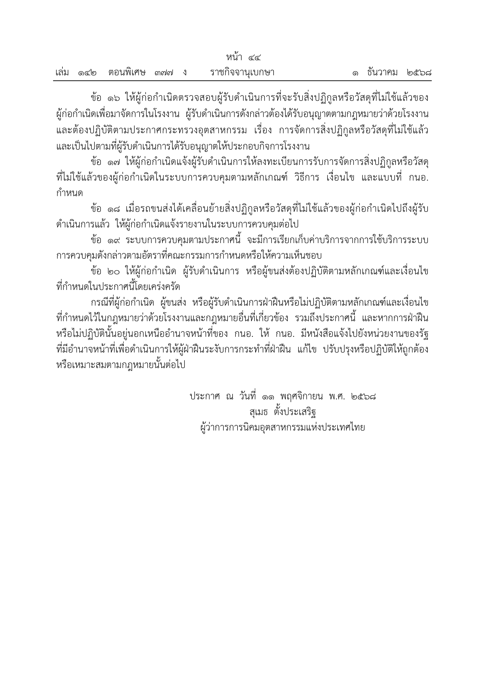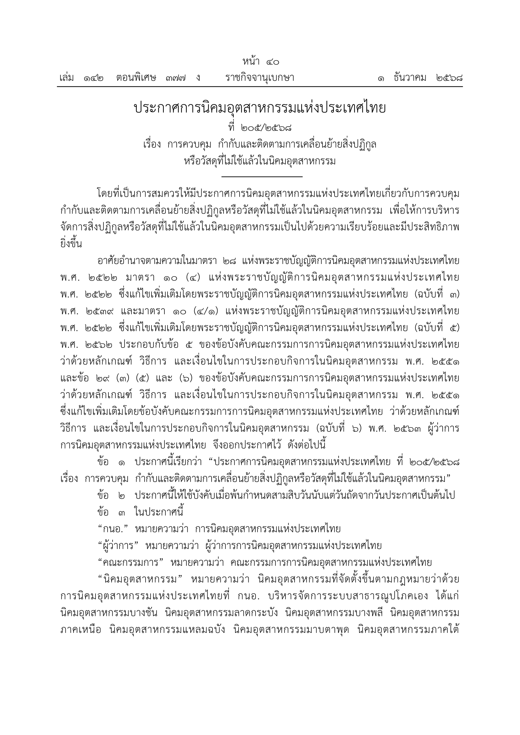 แห่งประเทศไทย ที่ 205/2568 ลงวันที่ 11 พฤศจิกายน 2568 เรื่อง การควบคุม กำกับและติดตามการเคลื่อนย้ายสิ่งปฏิกูลหรือวัสดุที่ไม่ใช้แล้วในนิคมอุตสาหกรรม เพื่อใช้ในการบริหารจัดการสิ่งปฏิกูลหรือวัสดุ