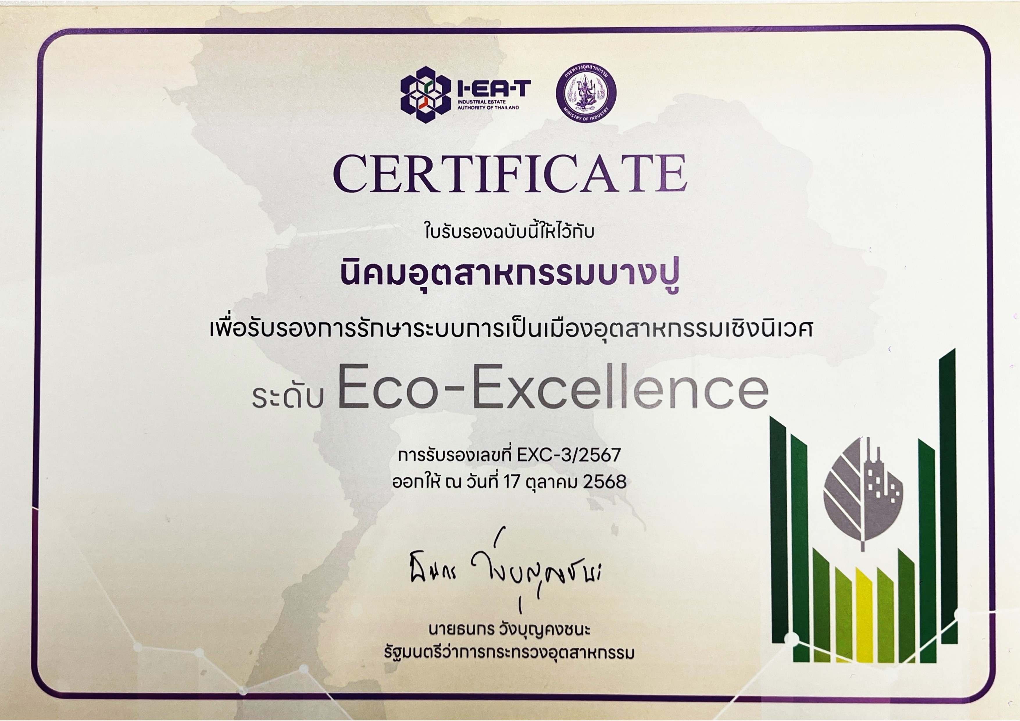 Certificate เพื่อรับรองการรักษาระบบการเป็นเมืองอุตสาหกรรมเชิงนิเวศ Eco-Excellence